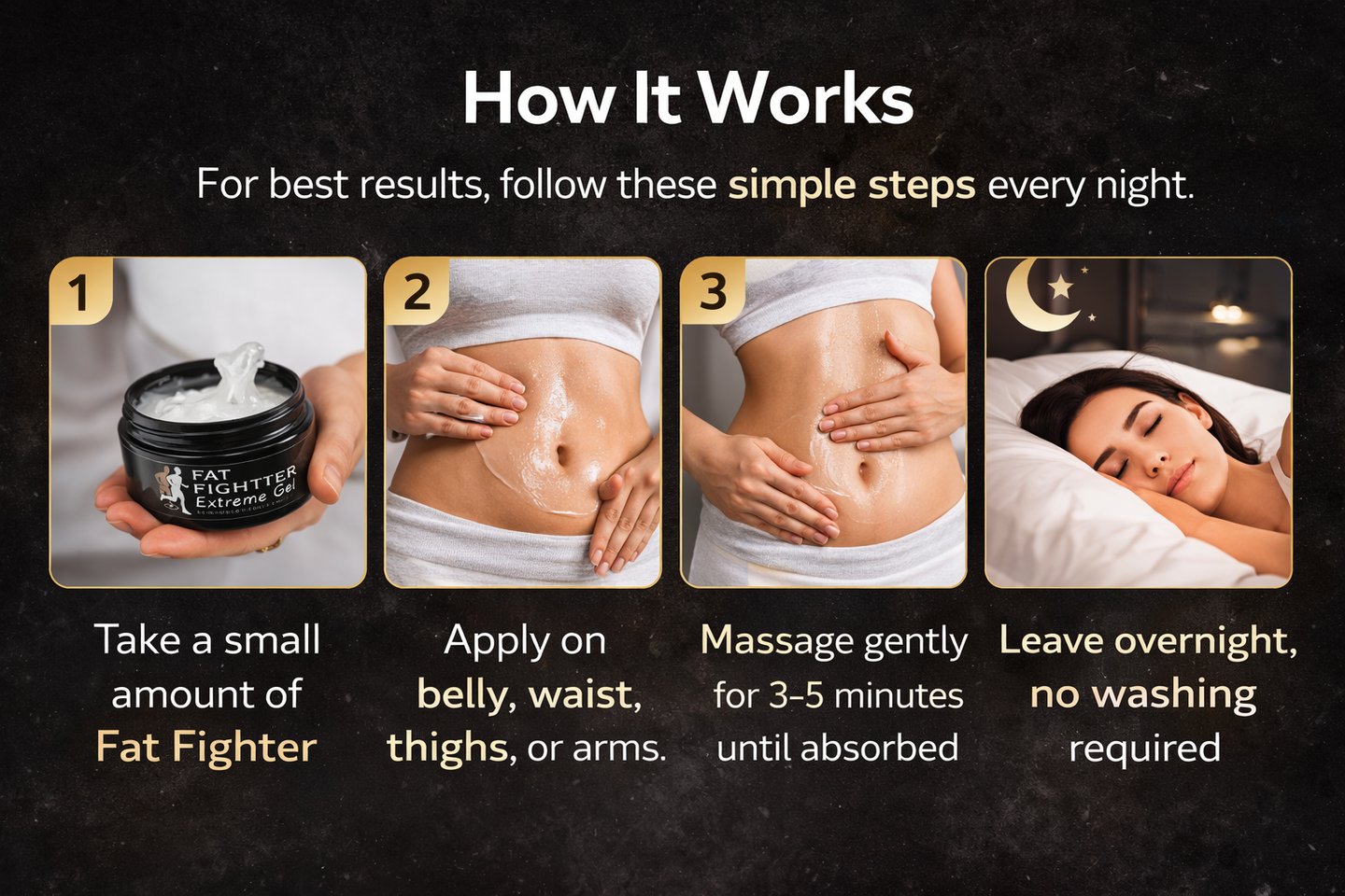 1. Apply Fat Fighter Gel on desired areas such as belly, thighs, or hips.